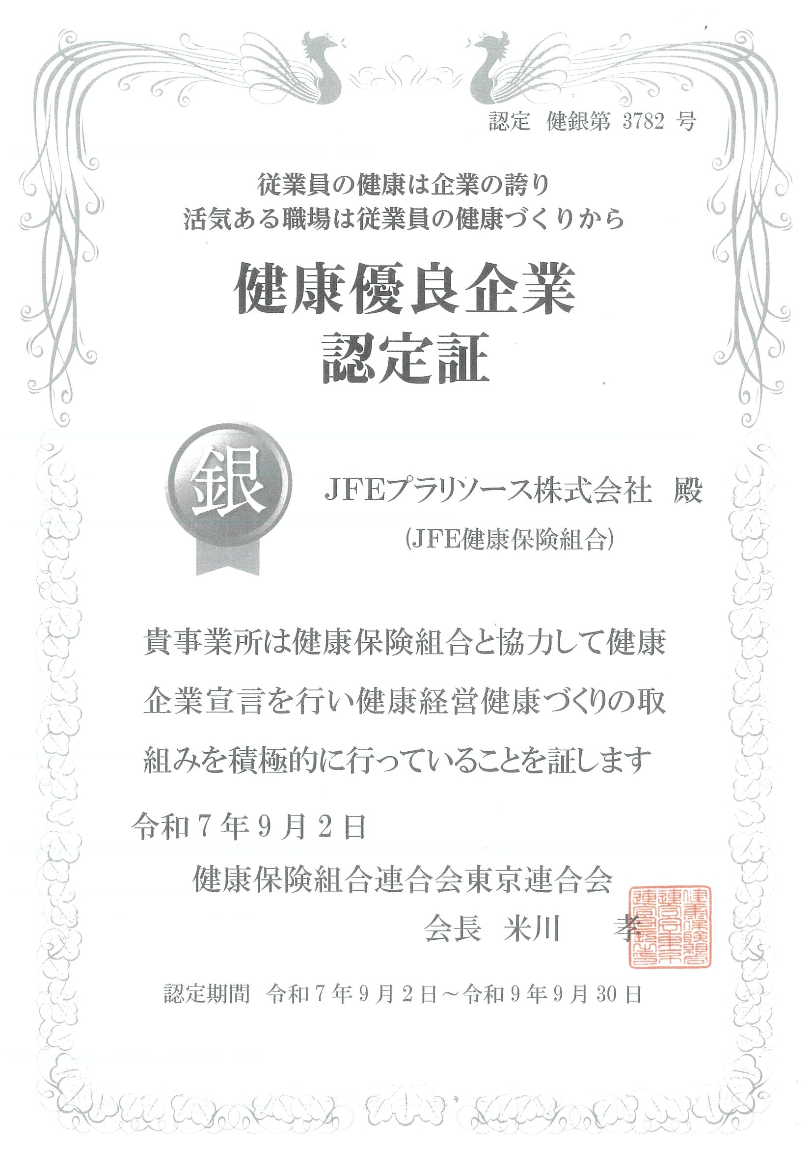 当社は、JFE健康保険組合と協力して2024年10月に健康企業宣言を行い、2025年9月2日付で健康優良企業「銀の認定」を受けました。