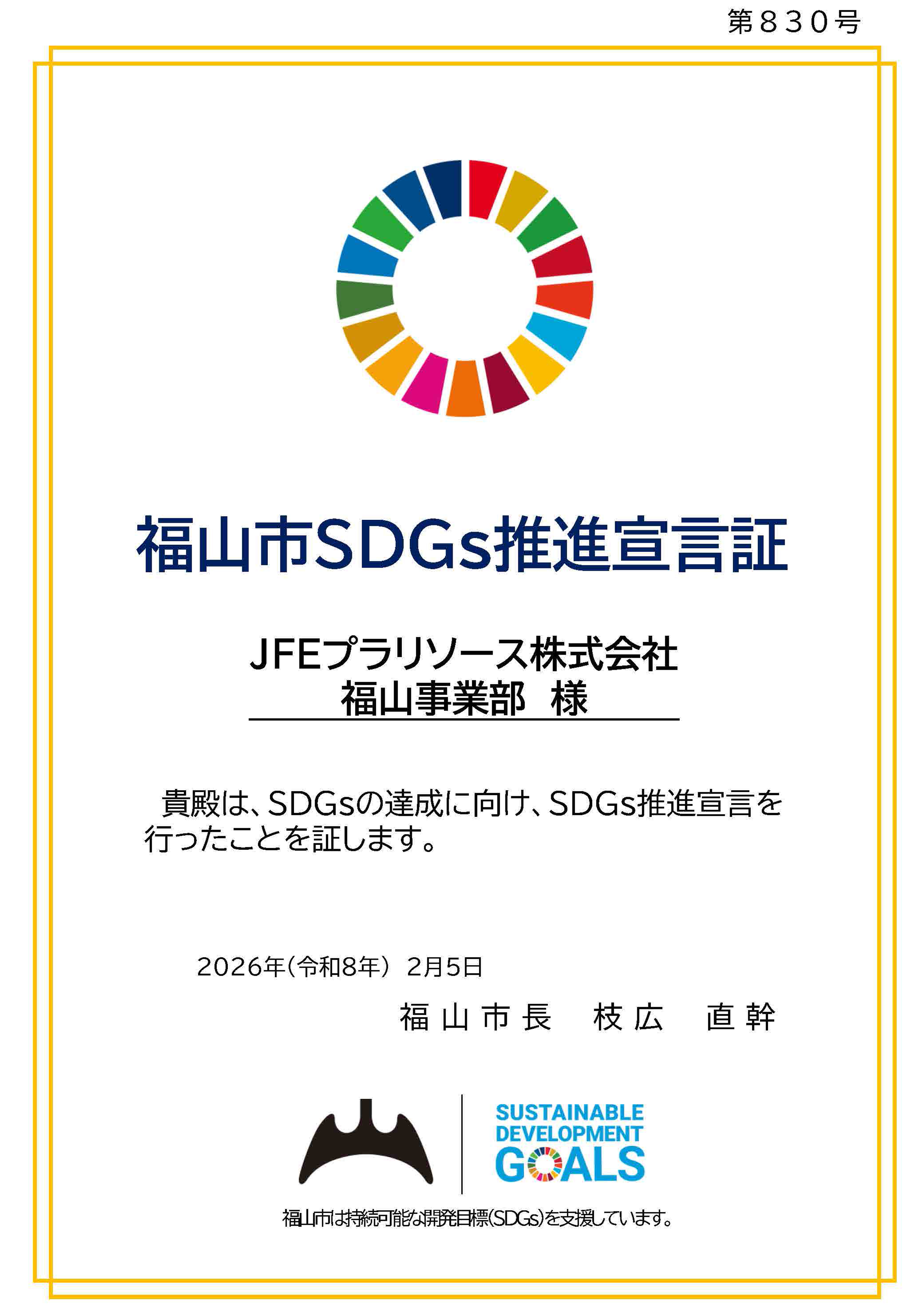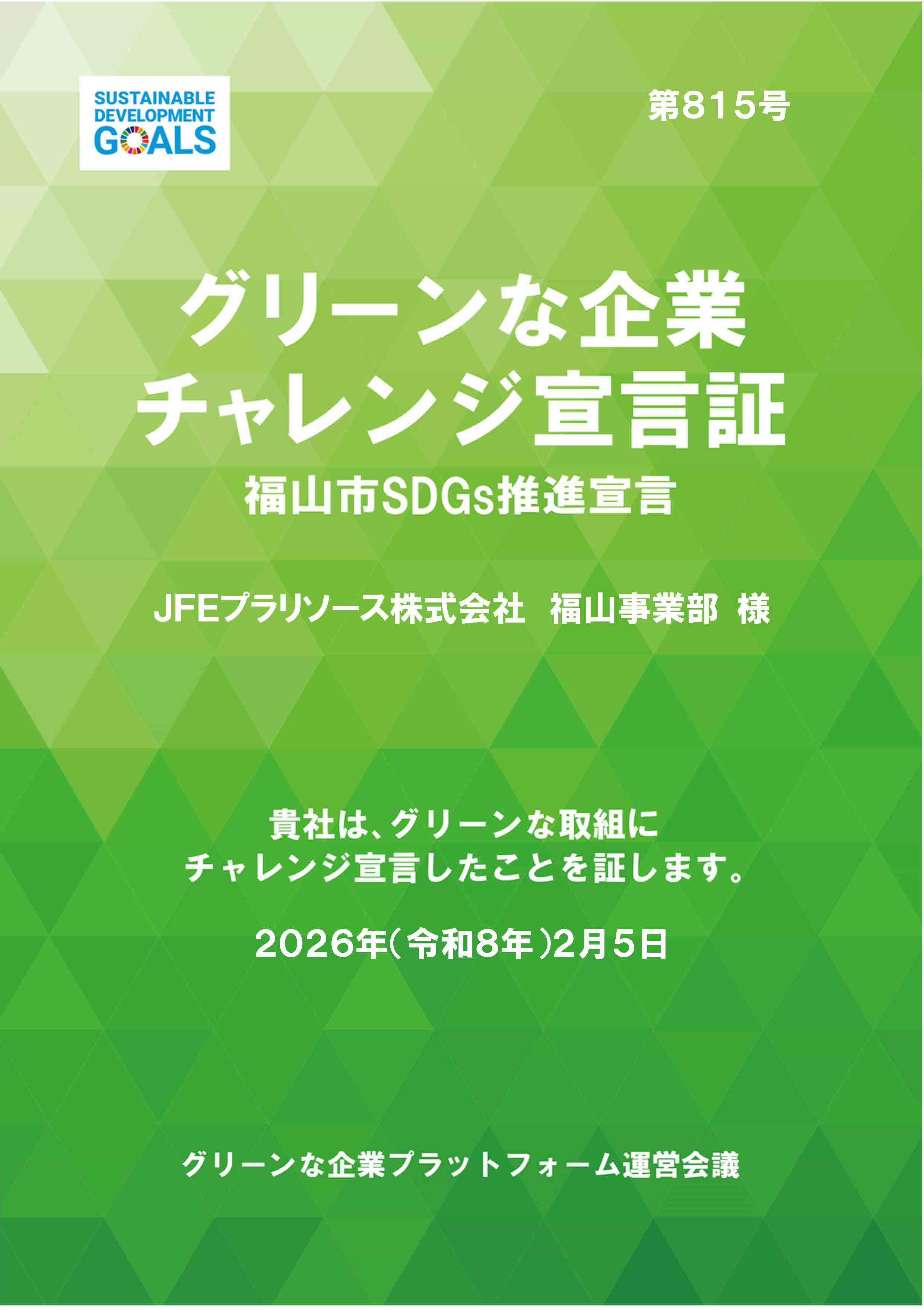 当社福山事業部は、グリーンな企業チャレンジ宣言およびSDGs推進宣言を行いました。